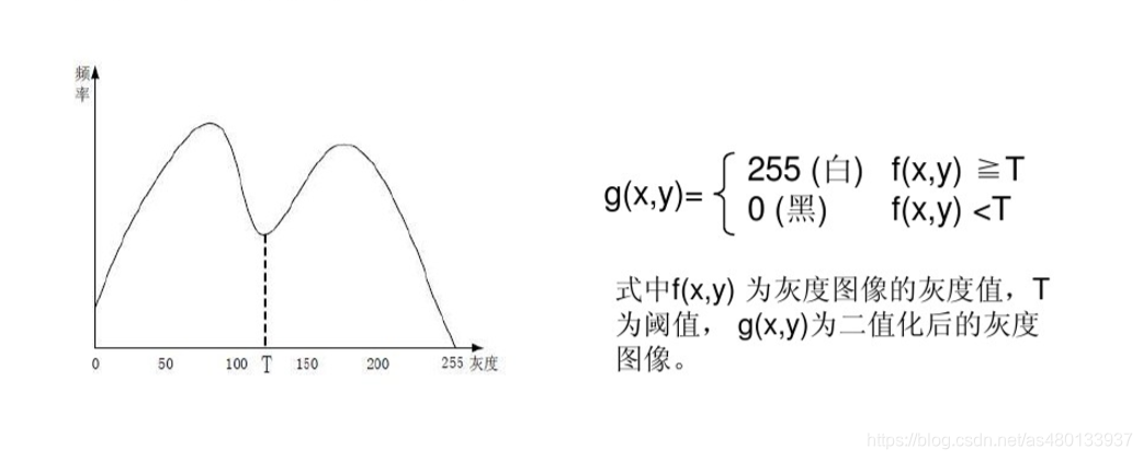介绍:如果图像灰度直方图呈明显的双峰状,则选取双峰间的最低谷出作为图像分割的阈值所在。,如下图,以T为阈值进行二值化分,可以将目标和背景分割开。