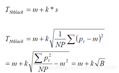 它根据以像素点为中心的邻域内的点的情况为此像素计算阈值。下面是每个像素阈值的计算公式,m是均值,s是标准差