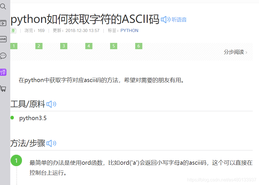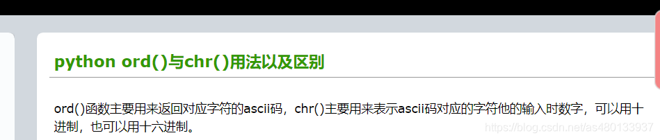 ord() 函数是 chr() 函数(对于8位的ASCII字符串)或 unichr() 函数(对于Unicode对象)的配对函数,它以一个字符(长度为1的字符串)作为参数,返回对应的 ASCII 数值,或者 Unicode 数值